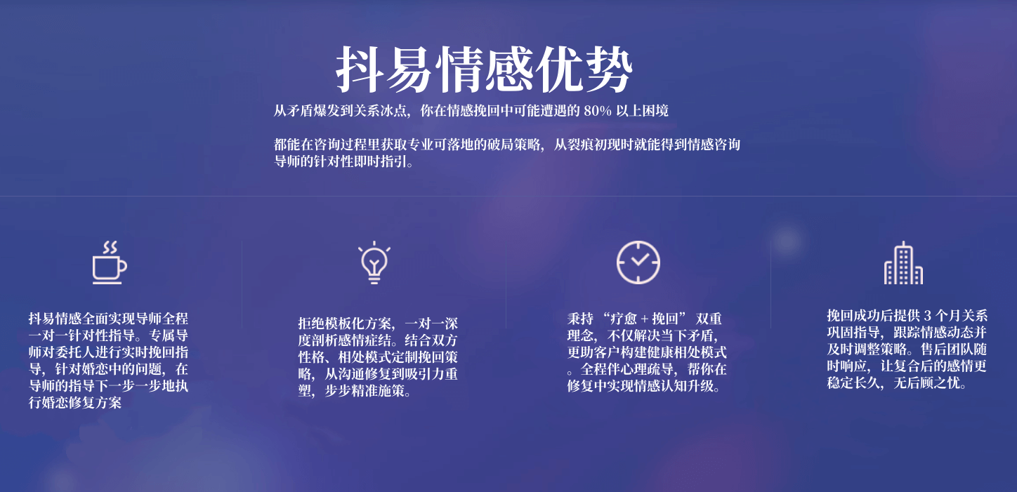 抖易情感 — 国内专业的婚姻情感咨询团队。早在 2010 年年初,抖易团队就已经涉足婚姻心理行业。2012 年,抖音情感团队正式成立工作室,期间开设了婚姻家庭与心理培训课程,针对在情感中迷茫的朋友们的情感困惑,教会他们了解爱、并且懂得如何去爱,制定解决方案,期间也获众多权威媒体报道。 2018 年,抖易情感团队进一步扩大规模,成立深圳抖易充科技有限公司。 目前抖抖易团队是由进化心理学专家、心理咨询师、婚姻家庭咨询师、婚姻家庭维权专家联合组成的权威队伍,专注两性情感解决方案。 抖易情感本着真诚、尊重、关爱的原则,专注于高效修复感情,挽救婚姻,分居情变矫正、婚前辅导、自我提升等情感咨询服务。 我们以婚恋咨询服务为依托,为帮助更多人获得高质量婚姻、收获甜蜜爱情、提高人们幸福指数。 为每一位来访需要咨询婚姻问题的客户提供尽可能的优质、安全、满意的服务,构建美好和谐的社会做出更多贡献。
